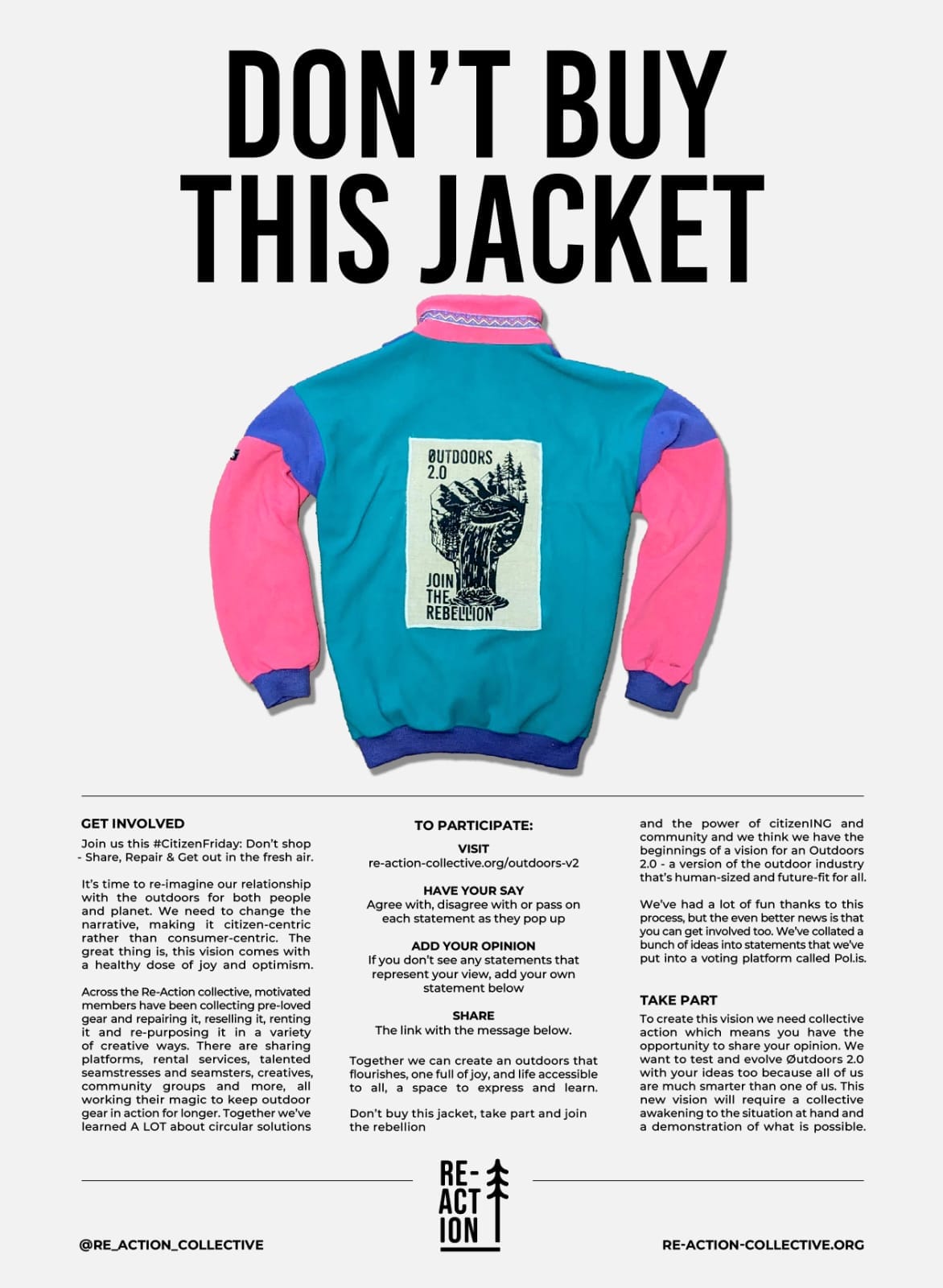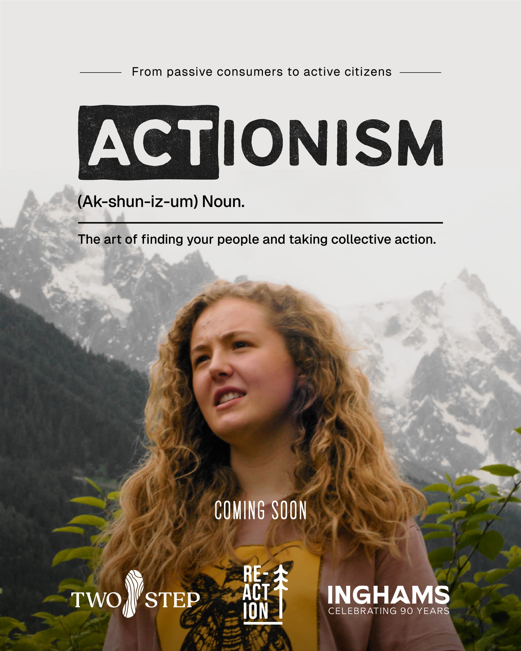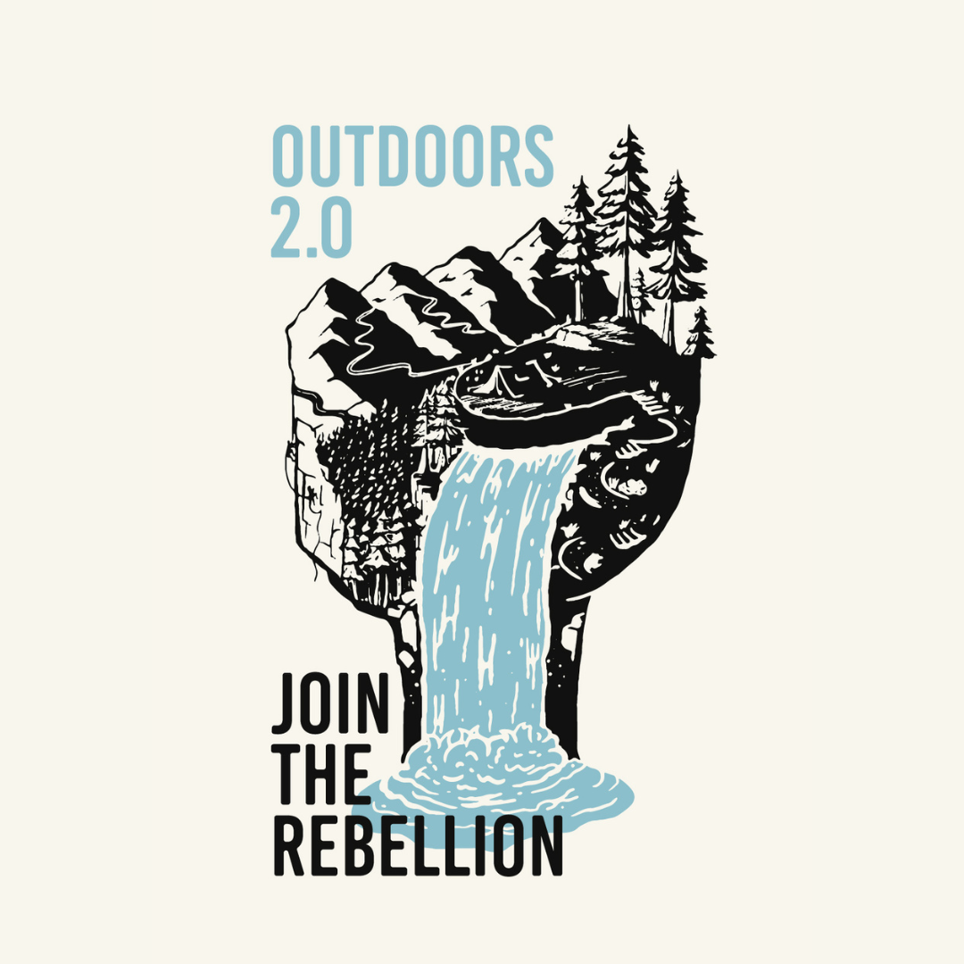 ‘’The Outdoors 2.0 graphic reimagines the classic alpine scene of mountains, trees, and waterfalls, transforming it into a bold silhouette that symbolises unity and the need for change. It’s designed to inspire action and rally people to join this new rebellion for a re-imagined future.’