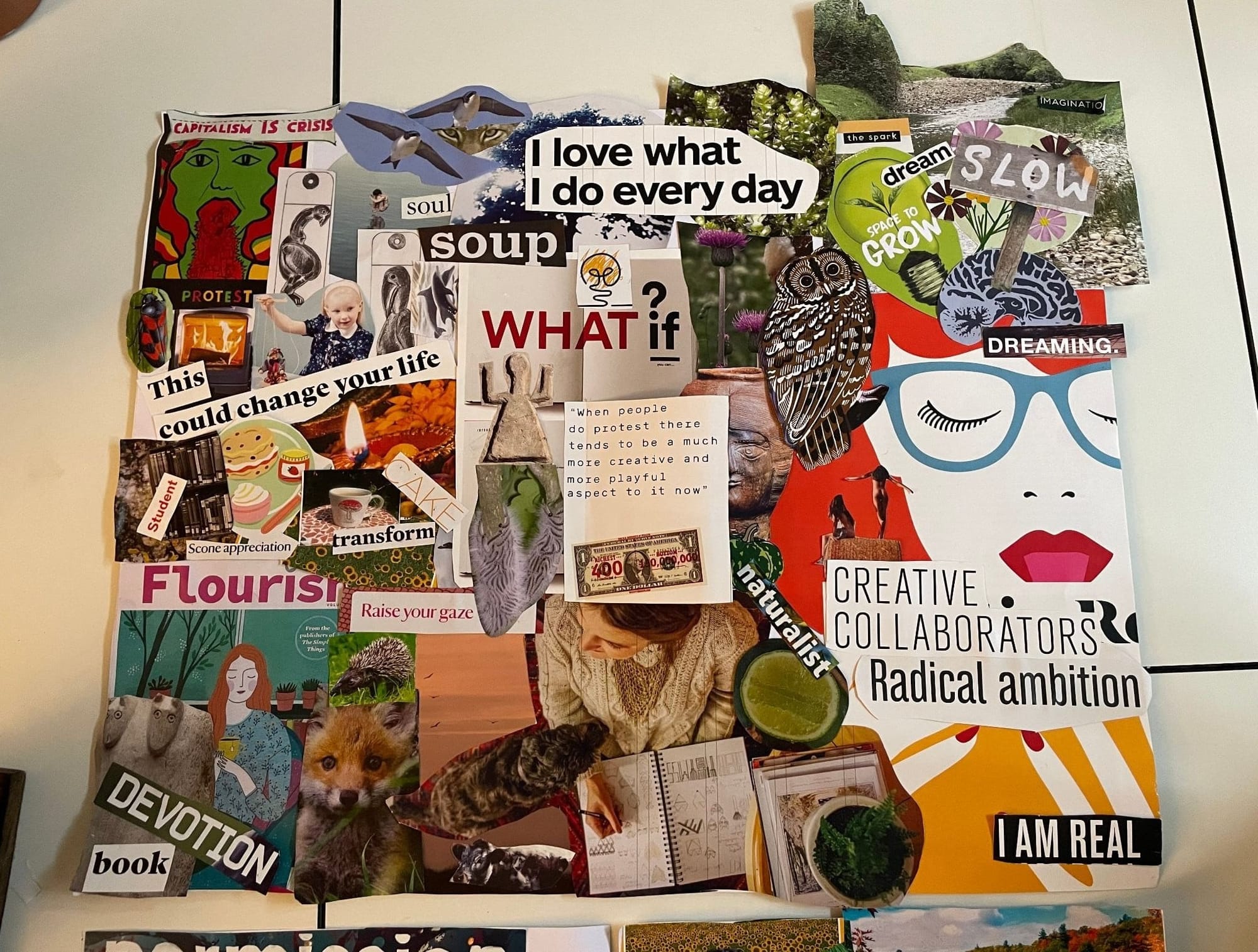 The sound of scissors, some big, some ludicrously small (“All I had was my penknife! I left my other scissors in London.” “What on earth…”), slices through paper and air. Cut outs and unread articles litter the floor. The board begins to take shape and energy and excitement grows (“What if we put this coming out of her head?”, “and what about this little dude, where should he go?”). This is co-creation in the flesh, gluey-fingered, shouts of laughter and exclamations as everyone stands, shoulder-to-shoulder round the table (“Guys, this is actually SO good.”).